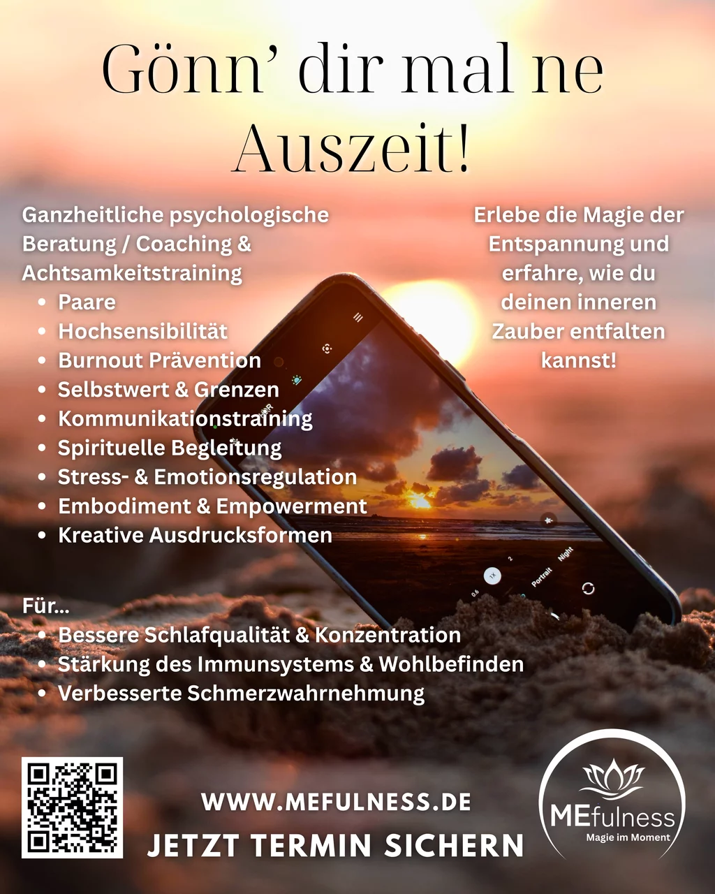 MEfulness steht für mehr als nur Meditation und Achtsamkeit – es steht für eine bewusste Rückkehr zu dir selbst. Das „ME“ im Namen trägt viele Bedeutungen: Es steht für mich selbst (me), für die Mindfulness Experience, für mehr Energie, mehr Echtheit, mehr Erleben – und vor allem für ein Leben, das wieder im Einklang mit deinem inneren Wesenskern schwingt.